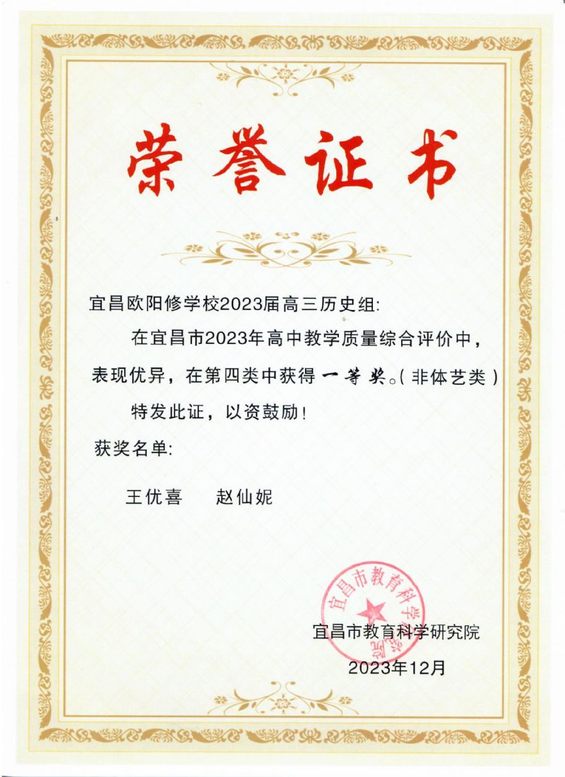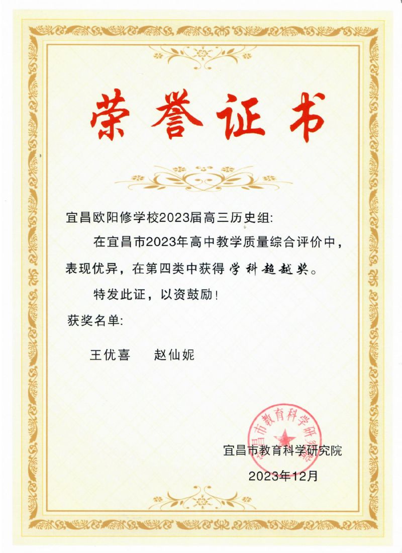 在宜昌市2023年高中教學(xué)質(zhì)量綜合評(píng)價(jià)中,我校高三歷史教研組表現(xiàn)優(yōu)異,榮獲同類學(xué)校一等獎(jiǎng)和學(xué)科超越獎(jiǎng)。