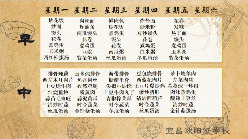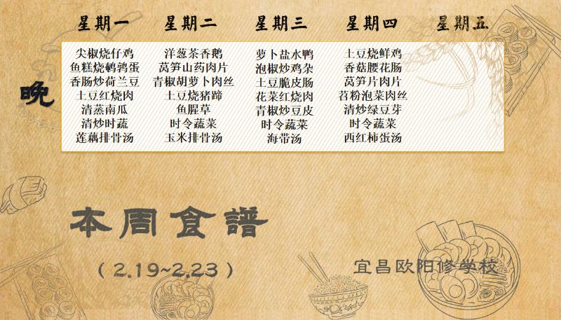 宜昌歐陽修學校每周食譜(2月19日至2月23日)
