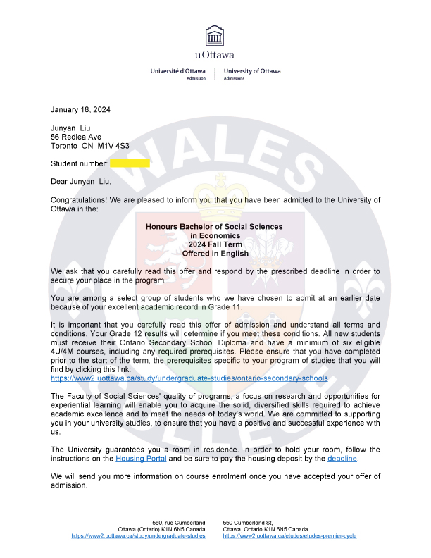 渥太華大學(xué)經(jīng)濟(jì)學(xué)和商科2個(gè)錄取offer!