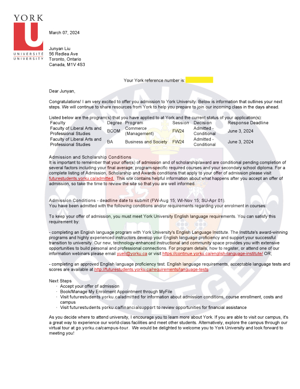 約克大學(xué)管理和商科2個(gè)錄取offer!