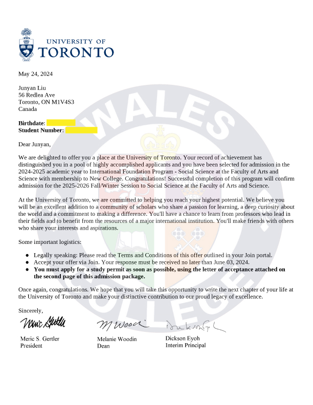 劉俊彥同學(xué)獲得QS全球排名21的多倫多大學(xué)主校區(qū)錄取offer!