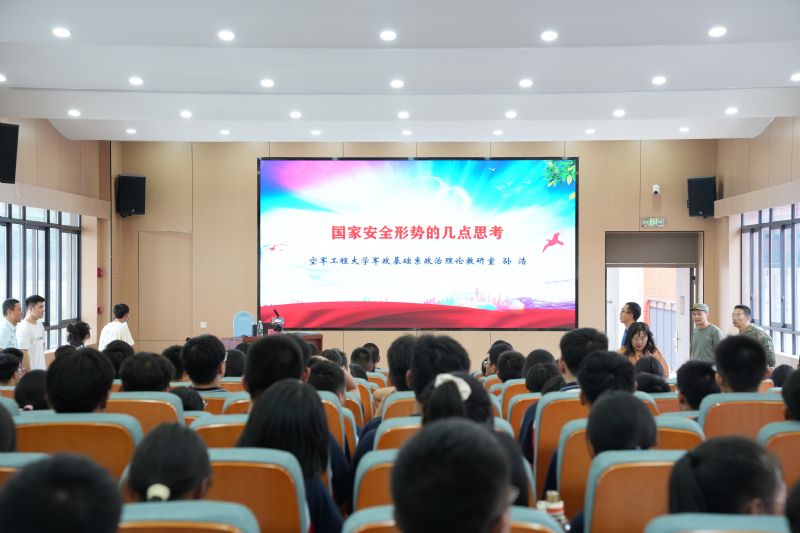 少年興則國興,少年強則國強。校園國防教育是全民國防教育的基礎(chǔ)。為進一步弘揚愛國主義精神,加強青少年思想政治建設(shè),深入挖掘愛國主義精神內(nèi)涵,賡續(xù)紅色血脈,厚植國防教育情懷和愛黨、愛國、愛社會主義情感。26日下午,學校組織高一新生開展有關(guān)《國家安全形勢的幾點思考》專題教育講座。講座上來自空軍工程大學軍政基礎(chǔ)系政治理論教研室的孫浩教授從當前我國國家安全面臨的時代特征、風險挑戰(zhàn)以及防范化解國家安全風險的內(nèi)外條件三個方面細致地介紹了國家安全形勢及變化,在同學們心底種下了一顆愛國、擁軍、強軍的種子。