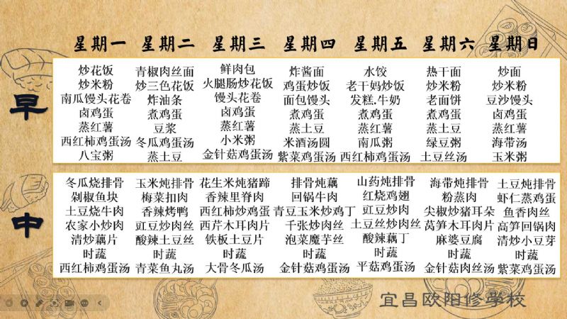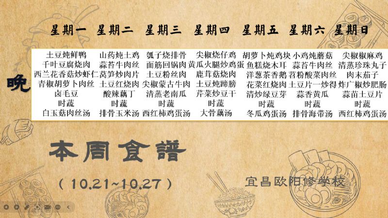 宜昌歐陽修學校每周食譜(10月21日至10月27日)