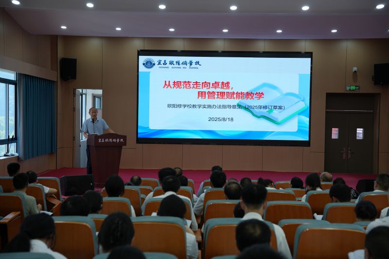吳校長講解宜昌歐陽修學?!稓W陽修學校教學實施辦法指導意見(2025年修訂草案)》,圍繞“從規(guī)范走向卓越,用管理賦能教學”的核心目標,出臺系列教學管理新規(guī),涵蓋教學實施、過程考評及質量獎勵三大方面,為提升教學質量奠定堅實基礎。