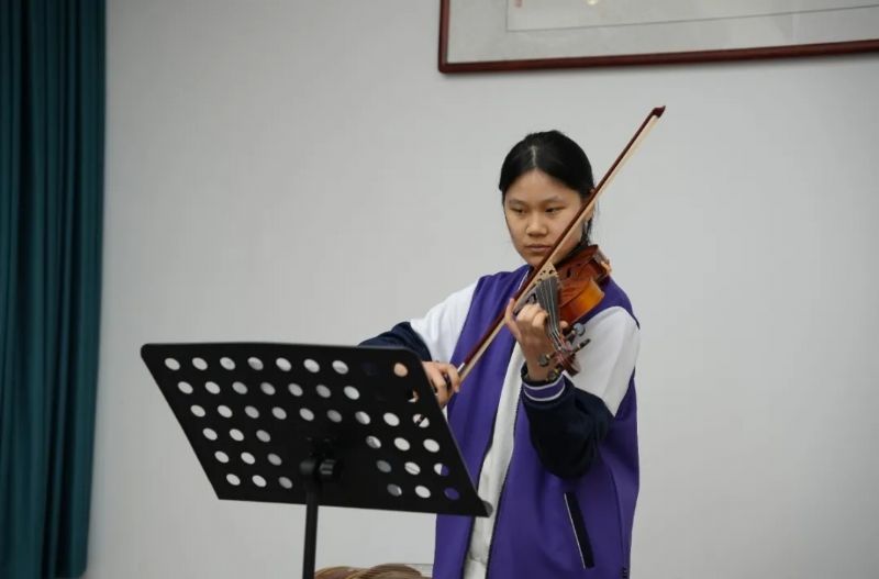 座談間隙,學生們的精彩表演讓現(xiàn)場溫情再升級:206班盧雨萱的古箏獨奏《春江花月夜》,弦音裊裊、古韻悠長;207班譚力的獨唱《心中的日月》,歌聲清澈、滿含敬意;208班劉彩雯的小提琴獨奏《月半小夜曲》,旋律流轉(zhuǎn)、祝福暗藏。孩子們專注的神情、真摯的情感,贏得老教師們陣陣掌聲。